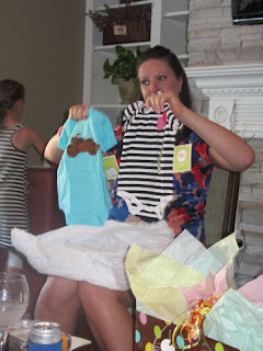 We played a few games, one where they had a rack with a bunch of baby items hanging on it that was visible to everyone at the party during social hour and while we ate, but of course not many noticed it as they were too busy chatting and catching up. So when the game started, the rack was covered and we had to list out everything that was on the rack. Tough one! The other game was guessing my girth in inches..haha. The one closest to 45.5 inches won! (yep, that was my official girth at the time!)